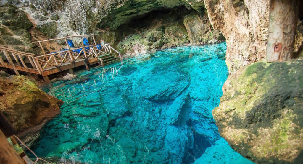 Located within Scape Park, in the Cap Cana area, this cenote offers a refreshing swim in fresh, natural spring waters. Surrounded by lush rainforest, Hoyo Azul sits at the foot of a 75-meter-high limestone cliff covered in vegetation.